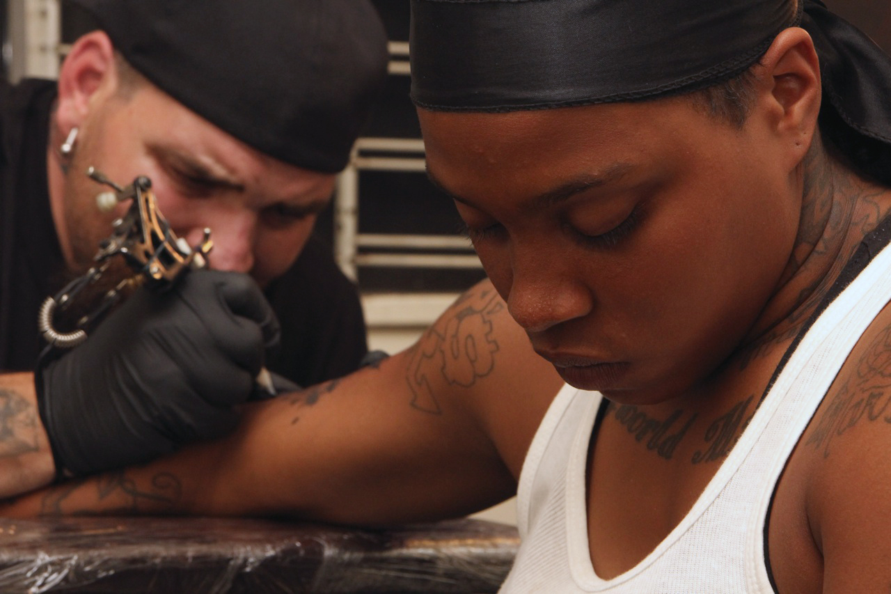 I was pretty much a fly on the wall in New Hope, shooting everybody that was willing---kids, elders, parents, whoever. I remember one night Shannon took me to a tattoo party, where a local artist comes to somebody’s apartment and tatts up as many people as he or she can. The tatts usually take about thirty minutes a piece and cost about $30-$100. Everybody out there has tatts. I stayed and flicked it up for about two hours but the air was so thick from blunt smoke I left woozy. That was my last night out there.