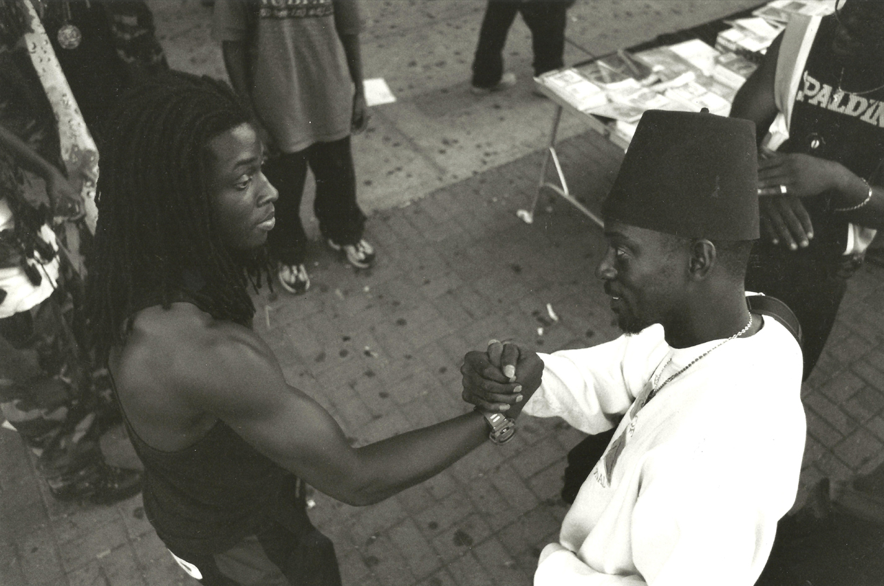 A month before the madness of 9/11, I was strolling streets up Broadway when I saw the cover of photographerJamel Shabazz’s first book, Back in the Days. Centered between two other books in the display window of Shakespeare & Company, Shabazz’s shot of too-cool Latino b-boys stancing defiantly (folded arms, ice grill expressions) on Da Deuce literally stopped me. Later, I learnt that Shabazz’s work had been published in The Source, Mass Appeal and Trace, yet somehow I had missed it until that moment. His work reminded me of the funk of James Brown, the prose of James Baldwin and the vision of artist Romare Bearden. I was blown away. Even its title, Back in the Days, was perfect, conjuring an old school gritty city hip-hop way of life when rap was young and so were we.